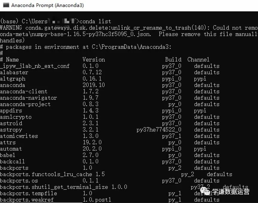 最后点击Anaconda Powershell Prompt输入conda list出现如下图所示列表即表示anaconda3 安装成功: